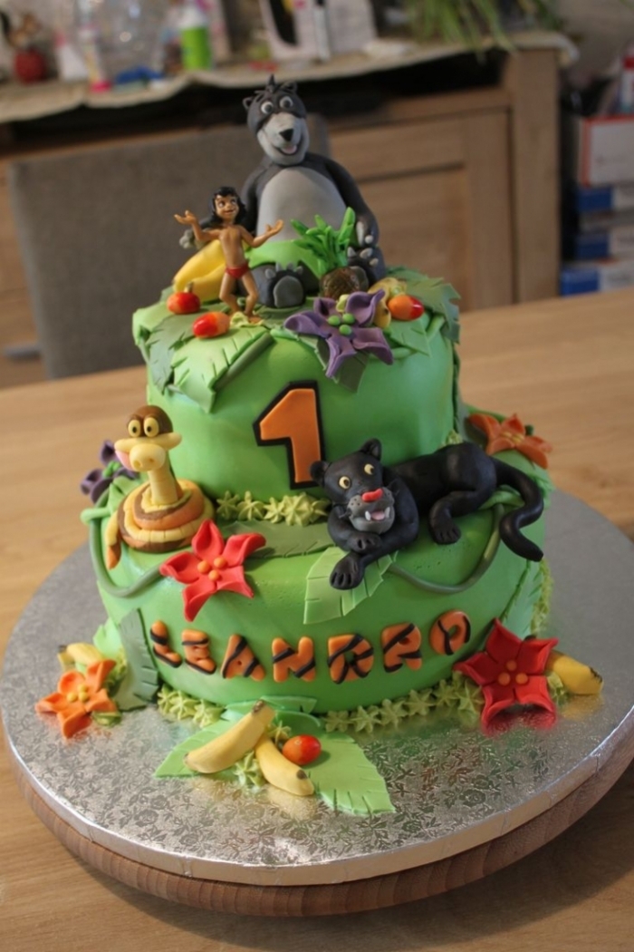 gateau d anniversaire du theme de la jungle avec differentes animaux au decor de feuilles et de fleurs 3919, image source: www.bestcakes.fr